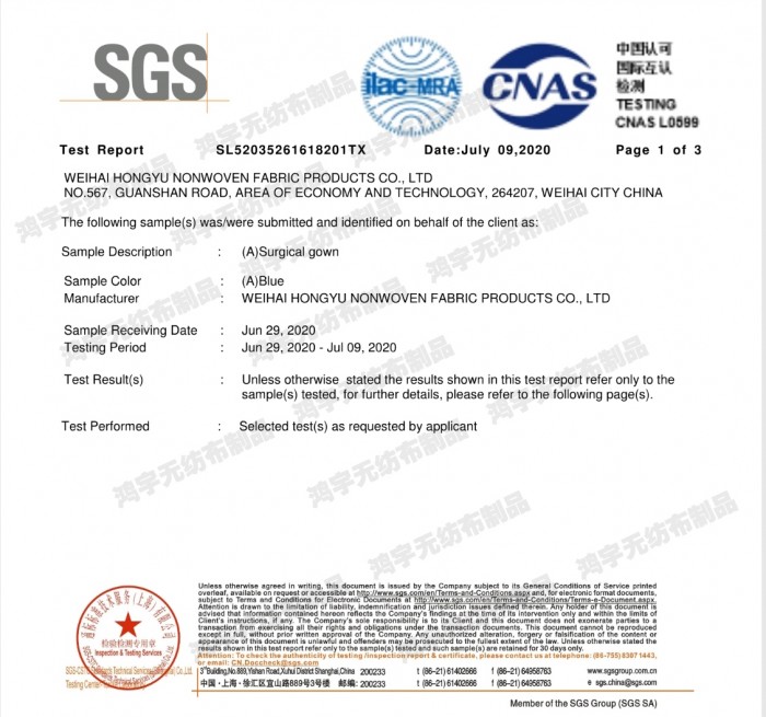 2020年6月29日,熱烈祝賀威海鴻宇無紡布制品有限公司榮獲得美標(biāo)3級(jí)手術(shù)衣SGS認(rèn)證