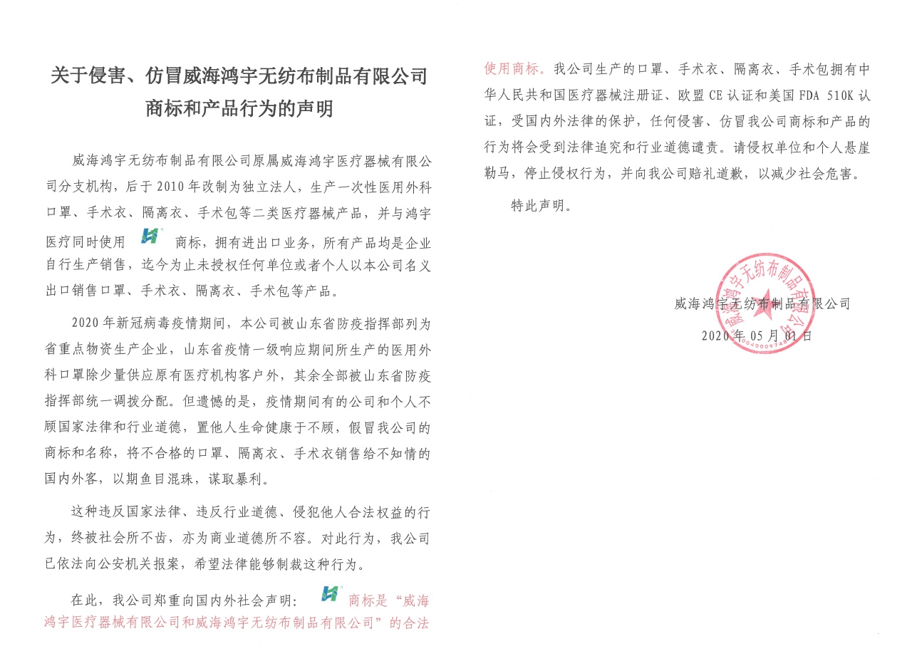 關于侵害、仿冒威海鴻宇無紡布制品有限公司商標和產品行為的聲明